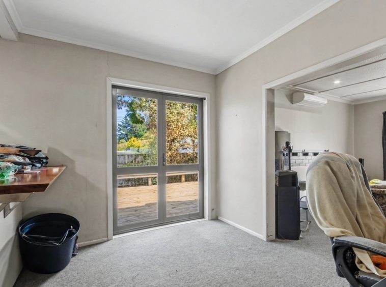 The open-plan kitchen and dining area flows effortlessly to a private, decked outdoor space—perfect for entertaining or enjoying quiet time outside. The bathroom includes a practical wet-floor shower for easy access.